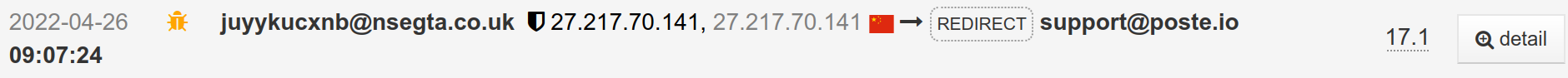 $ cat conn/3/6/36C26C1A-88AA-49B2-B4EA-BE43286094B6 2022-04-26T07:06:47.351Z [NOTICE] [core] connect ip=27.217.70.141 port=31211 local_ip=172.20.0.98 local_port=25 2022-04-26T07:06:47.351Z [DEBUG] [core] running connect_init hooks 2022-04-26T07:06:47.351Z [DEBUG] [core] running connect_init hook in guard plugin 2022-04-26T07:06:47.353Z [DEBUG] [core] hook=connect_init plugin=guard function=hook_connect_init params="" retval=CONT msg="" ...